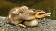 (未成熟な羽をばたつかせたり潜水をして遊びます) |