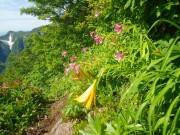 山頂に近くなるに連れて高山の花々が咲き誇ります。タニウツギ、ベニサラサドウダン、ツバメオモト、ゴゼンタチバナ、シラネアオイ 等々。主役のヒメサユリの美しさは格別。600Km、愛車を駆って会いに来た甲斐がありました。