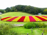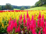 森林公園では、ピンク・黄・赤に咲く3種類の羽毛ケイトウ約50万本が、運動広場のなだらかな斜面に帯状に咲いており、花穂も約30㎝に伸び最盛期を迎えていました。花畑両横の小高い丘から見下ろすと3色の縞模様が鮮やかでした。羽毛ケイトウの花は、10月上旬頃まで楽しめるそうです。