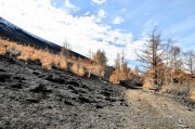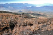 この日、相変わらず混雑する5合目広場を出発したのが9時半ごろ、さすがに気温は1℃だが、この秋一番と思われる快晴で寒さは感じない。「御庭」と呼ばれる地点までは道は整備され、ハイキングコースというより遊歩道だ(写真-1)。さすがに紅葉の見頃は過ぎているが、カラマツの黄葉はまだ美しいし、富士山が素晴らしい迫力で、山頂は手が届くかのような近さ。標高差はまだ 1500m近くあるのだが・・・(写真-2、3)。また、高さは富士山に次ぐ、日本第2位の北岳を中心に南アルプスの山並み、八ヶ岳、秩父の山々と続く大パノラマに足も止まる(写真-4)。