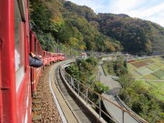 今回のメインは、アプト式区間の体験乗車と、大井川沿線の秋景色をトロッコ電車に乗ってのんびりと楽しむ1時間半。紅葉は時期尚早か?今一つであったが、高さ70mの鉄橋駅から見下ろす長島ダム放水の眺めはお勧め。また、5両編成の最終1両を我々団体に貸切り状態で世話してくれ、アプト式の説明やトンネルを抜ける毎に変わる風景を臨場感たっぷりに一生懸命話してくれた若き女性車掌さんの心意気に、大井川鉄道の株がOB連にはちょっと上がったようだった。
