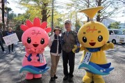 イチョウ並木で「ゆるキャラ」がお出迎え。学生たちがキャンパス内に準備してくれた休憩所で一休み。 |