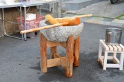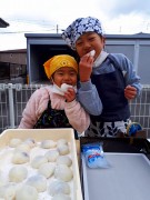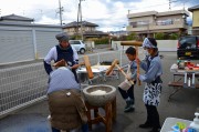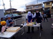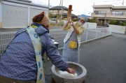 事前準備が完璧にされていたので予定通り10時に始まりました。子供達も含め参加者は皆前掛け、三角巾、マスクを着け20㎏のもち米を4回に分けて搗きました。子供用の杵も2本用意されており、イチ、ニイ、サンの掛け声に合わせて3本の杵が順に餅を搗く光景はとても感慨深いものでした。4回目のヨモギ餠は慣れてきたこともあってとてもいい仕上がりでした。合間のきな粉もち、あんころ餠の試食は格別でした。