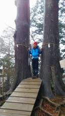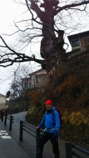 予定時間より少しオーバーして表参道コースにぶち当たりました。コンクリートの参道が山上集落の路地を進みます。途中、樹齢1000年の神代ケヤキを見上げます。