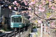 鳥居脇に小さな河津桜が植えられており、江ノ電の撮影スポットとしてファンに人気があります。 |
