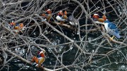 茂みから姿を見せ始めた『おしどり』の群れ・・・何故か、ゴイサギ(右端)も一緒に現れました |