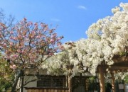 鎌倉鶴岡八幡宮境内の旗上弁財天社の白藤と八重桜 |