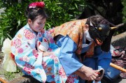 支度中の親子の様子。・・・子供に下駄を履かせているほのぼのとした瞬間・・・ |