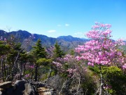 写真-3 アカヤシオが咲く小丸山からの眺望(左:奥袈裟丸山、中央遠方:皇海山)