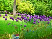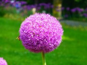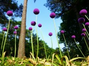 ポンポンの様な丸い花を咲かせる植物は「アリウム・ギガンチウム(和名:ハナネギ)」と云うネギの仲間で、すらっと伸びた花茎の先端に直径7~10㎝位の紫色の花を咲かせていました(巨大なネギ坊主)。