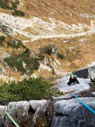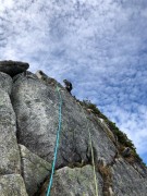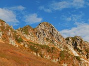 クラックにはプロテクション(カム)をセットして万一の落下時にカムで停止させる。素晴らしい秋晴れの中、登攀しながらカールや南アルプスの山並、更に奥に富士山を眺められた。