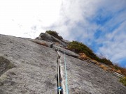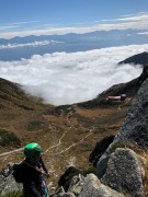 宝剣岳中央稜ルートは雪がないこの時期は植生保護のため下から取りつく事が出来ない。宝剣岳頂上からロープで懸垂下降して取りつきに行く。