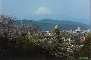 私の散歩コースにある船越堤公園の桜が、その花言葉の「優美な女性」にふさわしく華やかに咲き競っています。清水油槽所のタンク、清水港、世界遺産富士山(2013年登録)の構成遺産のひとつ三保松原、遠くには霊峰富士山(北東約40km)、駿河湾越しには伊豆半島の天城連山が遠望できます。