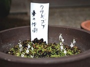 花の姿がうさぎの顔に見える事から、ウサギゴケと呼ばれるようになったそうです。1cm弱の小さな白い色の花は、よく見えるようにと鉢の横にはル-ペが置かれています。