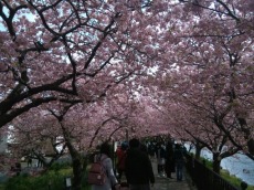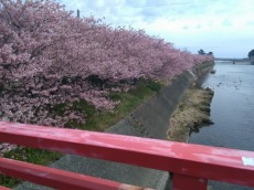 めっきり春めいてきた3月4日(金)、早咲きで有名な河津桜を見に伊豆の賀茂郡河津町に行って来ました。「河津桜まつり」は2月28日で終了していたものの、今年は例年に比べ開花が10日程遅れていた為、満開の桜を鑑賞することができました。菜の花の黄色、桜のピンクに空の青と、観光PR写真さながらの状況に大満足でした。ウイークデーに拘らず大勢の人出に、明日・明後日の休日は大混雑になるだろうと思いました。河津桜は、昭和30年頃地元の住人が偶然苗木を見つけ、自宅に移植し大切に育てて美しい花を咲かせたといわれています。昭和49年に新種の桜と認定され、発見された場所に因んで「河津桜」と命名されたそうで、「オオシマザクラ」と「カンヒザクラ」の自然交配種と推定されています。