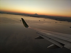 少し微睡んで気が付いたら、機体は既に東京湾上空にかかり、窓外に見えたのが富士の姿である。周りに雲は全くなく、赤く染まった残照に富士がくっきりと浮かんでいた。