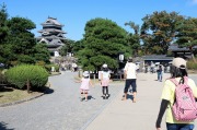 「本丸御殿跡」の庭園を進んで松本城の天守に向かいます。外国人観光客の姿も多く、登城できるまで40分待ちの混雑でした。 |
