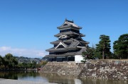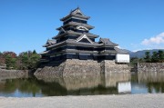 「内堀」越しに松本城の南東側からの眺めです。惜しいことに山沿いにはかなりの雲がかかっていて見えませんでしたが、好天時には城の背景に「常念岳」やアルプスの山々を臨むことができるようです。 |