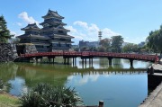 松本城の西側は鮮やかな赤い欄干の埋橋(うずみばし)の後ろに、大天守と隣の乾(いぬい)小天守を臨む景色です。 |