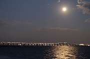 天候に恵まれ月が見える早朝の静かな海とアクアライン |