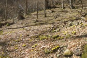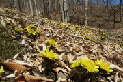 谷コースの前半は植林地帯で鹿除けネットや崩落地に戸惑いながら、後半は踏み跡のない涸沢を登って3時間、疲れを覚えた頃、忽然と「秘密の花園」が目に飛び込んできました。この瞬間は感激しました。山の南斜面50m×50m位の広さの所に福寿草が咲き誇っていました。2023年の状況でした。