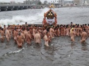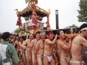 写真3 海上渡御を終えて、引き上げる神輿の勇壮な担ぎ手達