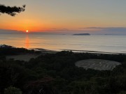 瀬戸内海の日の入りと「寛永通宝」の大きな銭形砂絵(右側) |
