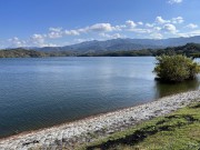 満濃池(国内最大の灌漑用ため池)、背後は讃岐山脈 |