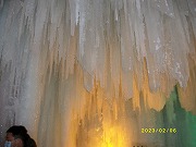 ホテル近くで開催されてる夜の『層雲峡氷瀑祭り』を見学。ライトアップされた氷の世界はとても綺麗で幻想的ではありましたが、氷点下15℃の極寒の夜、年寄には酷で30分程の見学が限界でした。 |