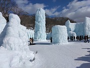 昼間の見学のためか、層雲峡の氷瀑まつりに比べ若干見劣りした感じだが、高い透明度を誇る支笏湖の湖水で作られた作品には神秘的な風景が感じられました。 |