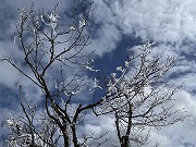 今年は新潟県魚沼の里山スノーハイクのツアーに参加し、スノーシューを楽しんできました。 1日目は足慣らしで、魚沼市の大力山504mを雪の感触を確かめながらスノーシューで登りました。頂上近くでは木の枝に付着した雨氷を見れました。雨氷は、上層から降ってきた雪が大気の中層に入り込んだ暖かい空気で溶けて水滴となり、地表近くの冷気に冷やされて過冷却状態になり、枝に当たった瞬間に凍り付いてできるとのことです。