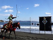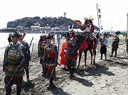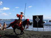武者行列は午前中江島神社の参道を練り歩き、江島神社辺津宮で戦勝祈願を行い、午後に片瀬東浜海岸に移動して、源頼朝公が率いる武者行列の行進と、疾走する馬上から3つの的を射る勇壮な流鏑馬が披露されました。