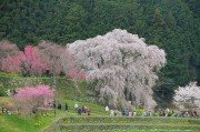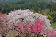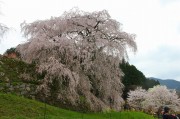 又兵衛桜は奈良県宇陀市にあり、車で片道約2時間かかります。平日(4/5<金>)を狙って行ったのですが、駐車場には約500mの行列の中、30分待ち程度で駐車できました。初めてでしたけど、枝垂れ桜が見事な枝振りを見せ満開で感動しました。