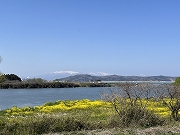 菜の花と阿武隈川、白い蔵王連峰、いい眺めです |