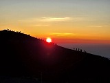 3日目(最終日)3時起床。朝食後4時半のご来光を拝みに外へ。風速7m/s、気温4℃快晴、東の空が明るくなり始め、その後少しずつ顔を見せた真っ赤なご来光を拝みました。東に朝日、西に満月、朝日に照らされてできた影富士、感激もひとしおでした。