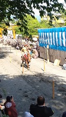 目の前5メートル程先の「桜の馬場」を、小笠原流一門の奉仕者15騎が疾走。約50センチ四方の的2基を射抜くのは鍛錬を重ねている射手でも難しく、両方の的を射抜けたのは1騎だけでした。スマホではスピード感と迫力を伝えられないのが残念ですが、機会があれば是非一度体験されることをお勧めします。