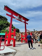 二か所目は、長門市の絶景スポットとして人気のある元乃隅(もとのすみ)神社です。日本海に面した断崖絶壁の上に123基の朱色の鳥居が100m以上にわたって並んでいます。また、鳥居の高さは6m、賽銭箱の位置は5mの高さにあり「日本一入れにくい賽銭箱」の投げ入れに挑戦してきました。