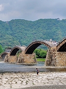 五か所目は、岩国市にある日本三大橋の一つである錦帯橋です。アーチが美しい五連の木造橋で長さ193.3m、幅5mで木組みの高い技法で作られています。岩国城は錦川を天然の堀として両岸に城下町を造営したため流されない橋が必要となりました。