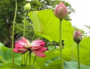 今年、同センタ-でもなかなか見る事の少ない、奇跡の蓮といわれる「双頭連(そうとうれん)」の花芽(品種:紅ガニ)が見つかり話題となりました。1本の茎に2つの花を咲かせる事から「双頭連」と呼ばれ、およそ3万本に1本あらわれるといわれるほど蓮のどの品種にも突然変異で起きる現象との事です。 又、双頭連を見ると良い事が起きる吉兆や、幸せになれるなどの言い伝えがあるそうです。多くの人が観賞に訪れて「双頭連」や、紅白、ピンクの色鮮やかな蓮の花にカメラを向けていました