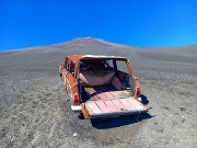 標高2050m辺りに放置されておよそ40年、車種はアメリカのクライスラー社製Jeepのグランドワゴニア。四駆をもって富士山山頂を目指すもここで走行不能になり、放置されてしまった。その時代は車両での富士山走行は出来たようで、車両の走行性能テストも行われたようである。