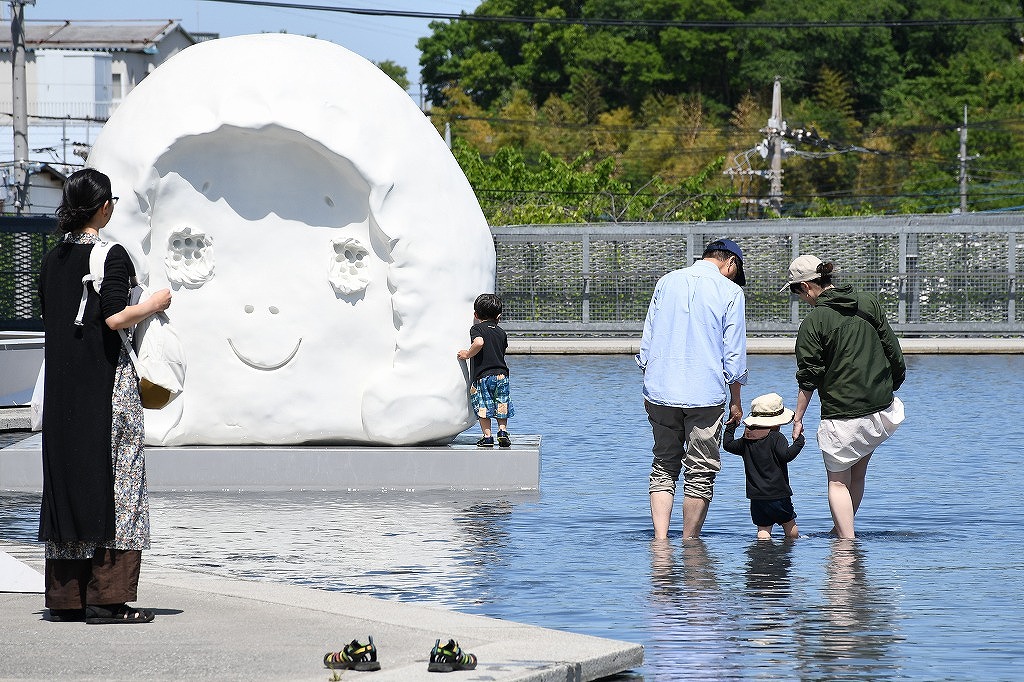 ところざわサクラタウン、角川武蔵野ミュージアム裏の様子です。水辺で親子が水遊びをしていました。