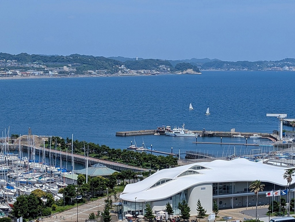 江島中津宮は、853年に慈覚大師(じかくだいし)により創建され、近くの展望台付近からは、 江の島ヨットハーバー、先には七里ガ浜が望めます。