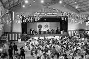 和工体育館で従業員家族と一緒に祝った創立30周年記念行事。ステージ上でドラムを叩いているのが音楽部時代の本人。 |