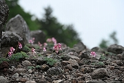 コマクサ。厳重な金網の向こうに咲いているので、写真のアングルはかなり限られます。この散策の後向かった、浅間高原シャクナゲ園駐車場には大量のコマクサが植栽されていました。 |